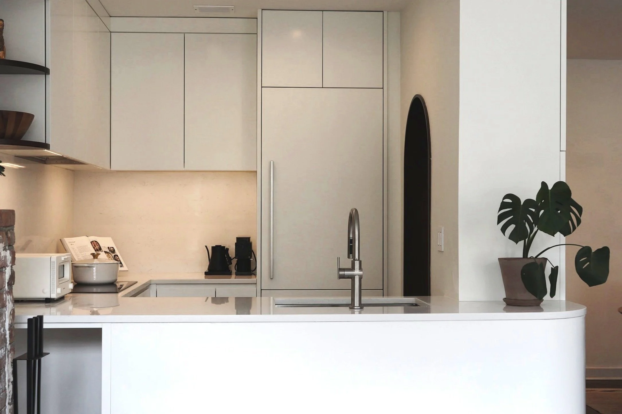 This space features a minimalistic millwork design, Fisher Paykel appliances, an archway portal to connect Dining and Kitchen, plus a hidden bar and storage space within the built-ins.